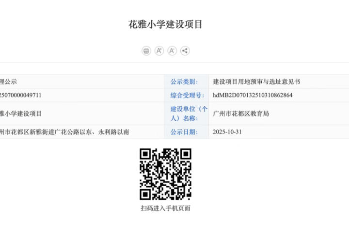 2025年10月31日,广州市规划和自然资源局官网发布了花雅小学建设项目的建设项目用地预审与选址意见书受理公示。项目拟新建花雅小学,办学规模为36班,共1620个学位。项目主要建设内容包括新建教学综合体约16240平方米、室内体育用房约2460平方米,并建设室外体育场地、绿化工程、道路广场等配套工程。项目施工计划工期为2025年11月开工,2027年5月完成建设。